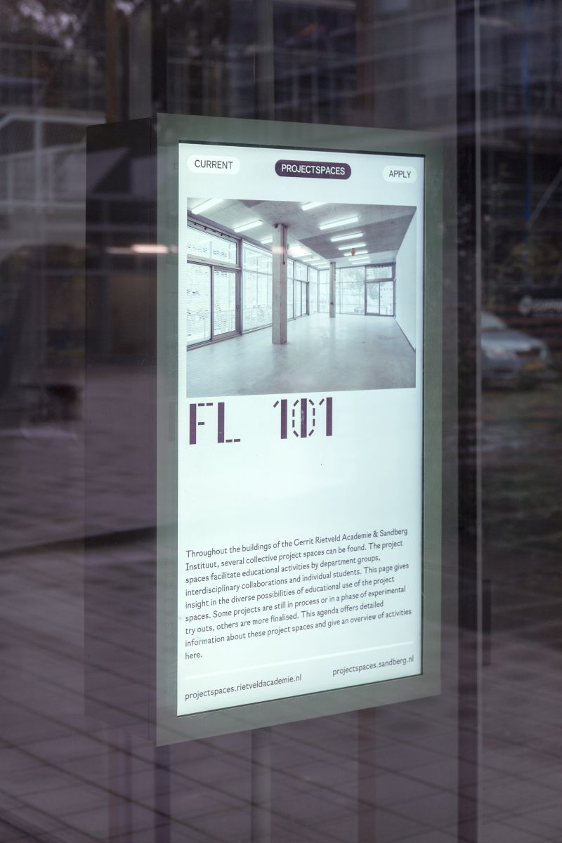 Throughout the buildings of the Gerrit Rietveld Academie & Sandberg Instituut, several collective project spaces can be found. The project spaces facilitate educational activities by department groups, interdisciplinary collaborations and individual students. We designed and developed, in collaboration with Our Polite Society, a website and a corresponding display as part of the buildings. This digital platform gives insight into the diverse possibilities of educational uses of the project spaces. The design derives from the previously developed signage system and a daily color system.